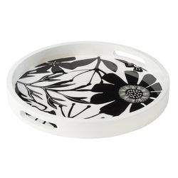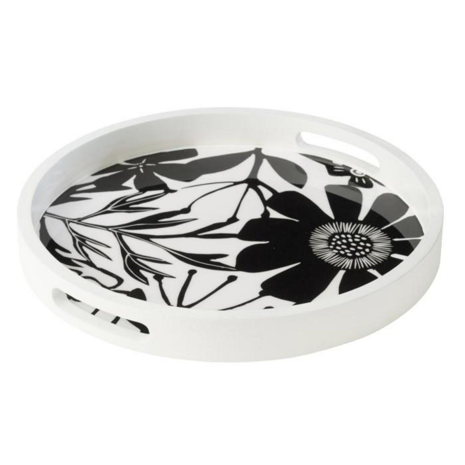 Informations Techniques : Dimensions : D. 40 x H. 4,5 cm Matières : Bois (Manguier) & MDF Spécificités : Robuste & Pratique Plateau de service rond Imprimé floral Poids : 1 kg Couleur : Noir & Blanc