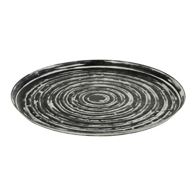 Informations Techniques : Dimensions : D. 51 x H. 3 cm Matière : Métal Spécificités : Déco & Utile Plateau de service Motifs cercles Forme ronde Poids : 1,14 kg Couleur : Noir