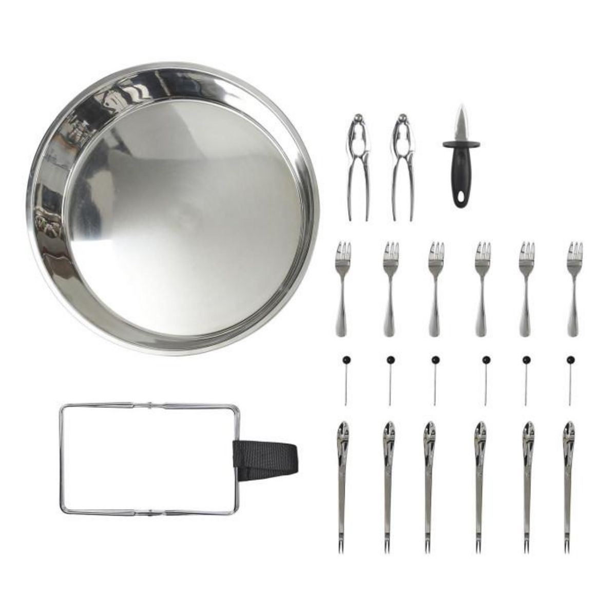Informations Techniques : Dimensions : D. 40 cm Matières : Métal, Acier inoxydable, Fer, Polypropylène & Bois (Pin) Spécificités : Pratique & Utile Plateau de Service Pour Fruits de Mer 22 Accessoires Forme Ronde Poids : 1,09 kg Couleur : Argent