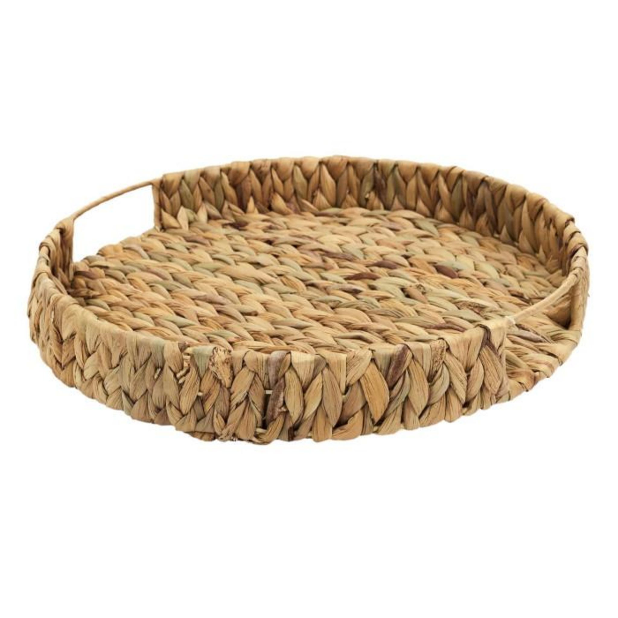Informations Techniques : Dimensions : D. 40 cm Matière : Bois Spécificités : Pratique & Utile Plateau de Service Forme Ronde Effet Tressage Poids : 0,46 kg Couleur : Beige
