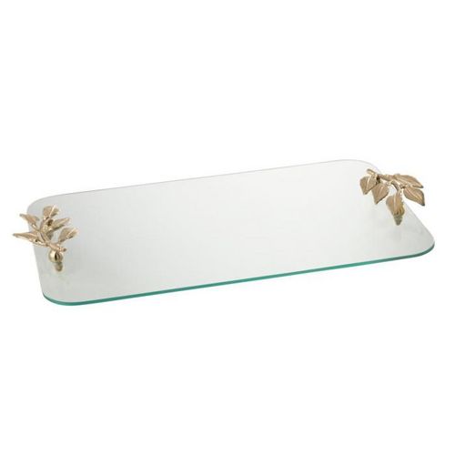 Informations Techniques : Dimensions : L. 50 x l. 30 x H. 4 cm Matières : 80% Verre & 20% Métal Spécificités : Élégant & Déco Plateau rectangulaire Poignées design feuille Poids : 2,15 kg Couleur : Transparent & Or