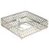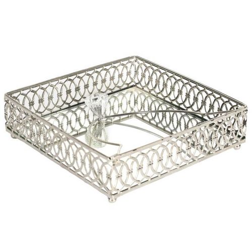 Informations Techniques : Dimensions : L. 16,8 x l. 16,8 x H. 4,8 cm Matières : 50% Verre, 40% Métal & 10% Plastique Spécificités : Déco & Utile Plateau porte-serviettes Serviettes non incluses Forme carrée Poids : 0,29 kg Couleur : Argent