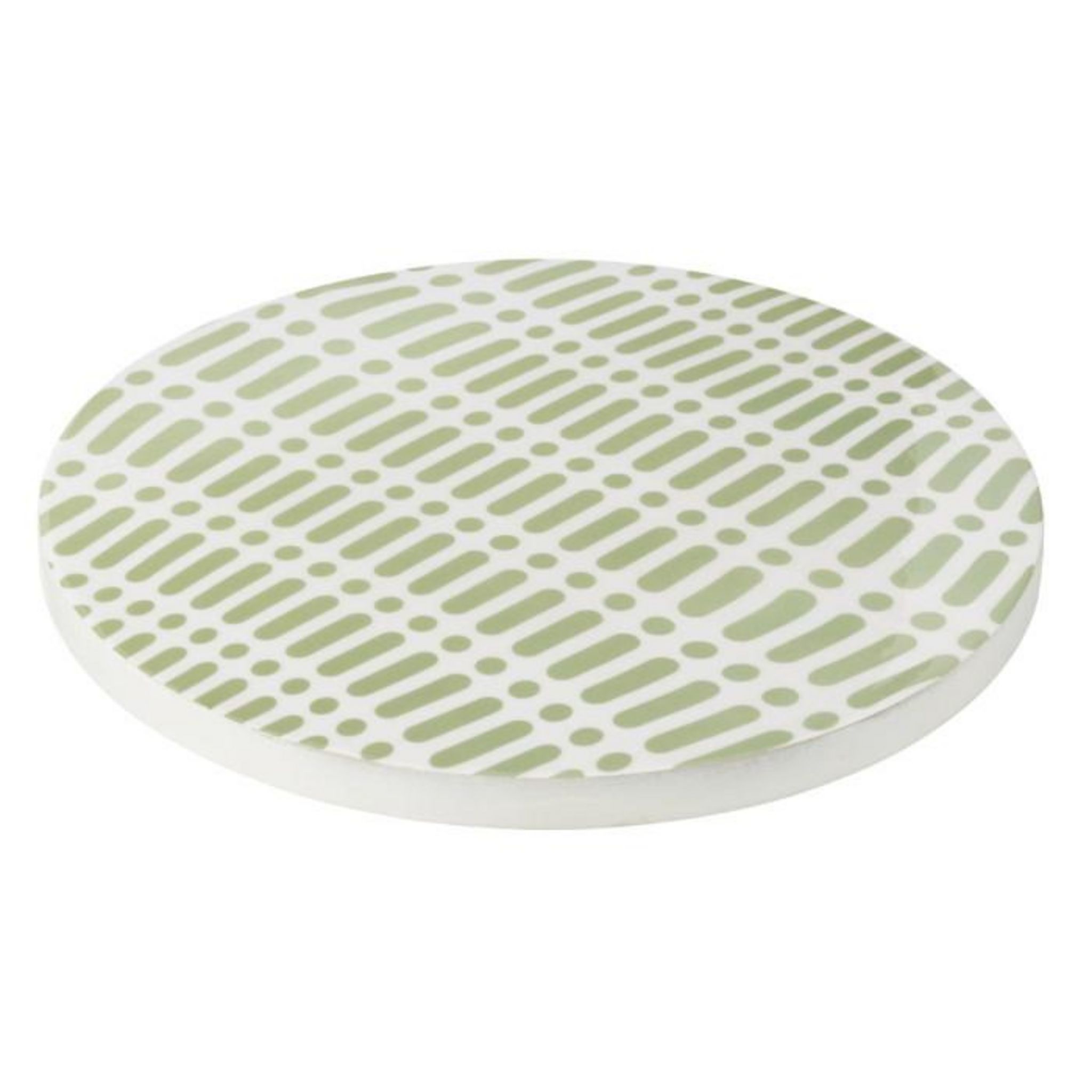 Informations Techniques : Dimensions : D. 45,5 x H. 5 cm Matière : Bois (Manguier) Spécificités : Robuste & Pratique Plateau tournant rond Motif imprimé Poids : 3,41 kg Couleur : Vert & Blanc