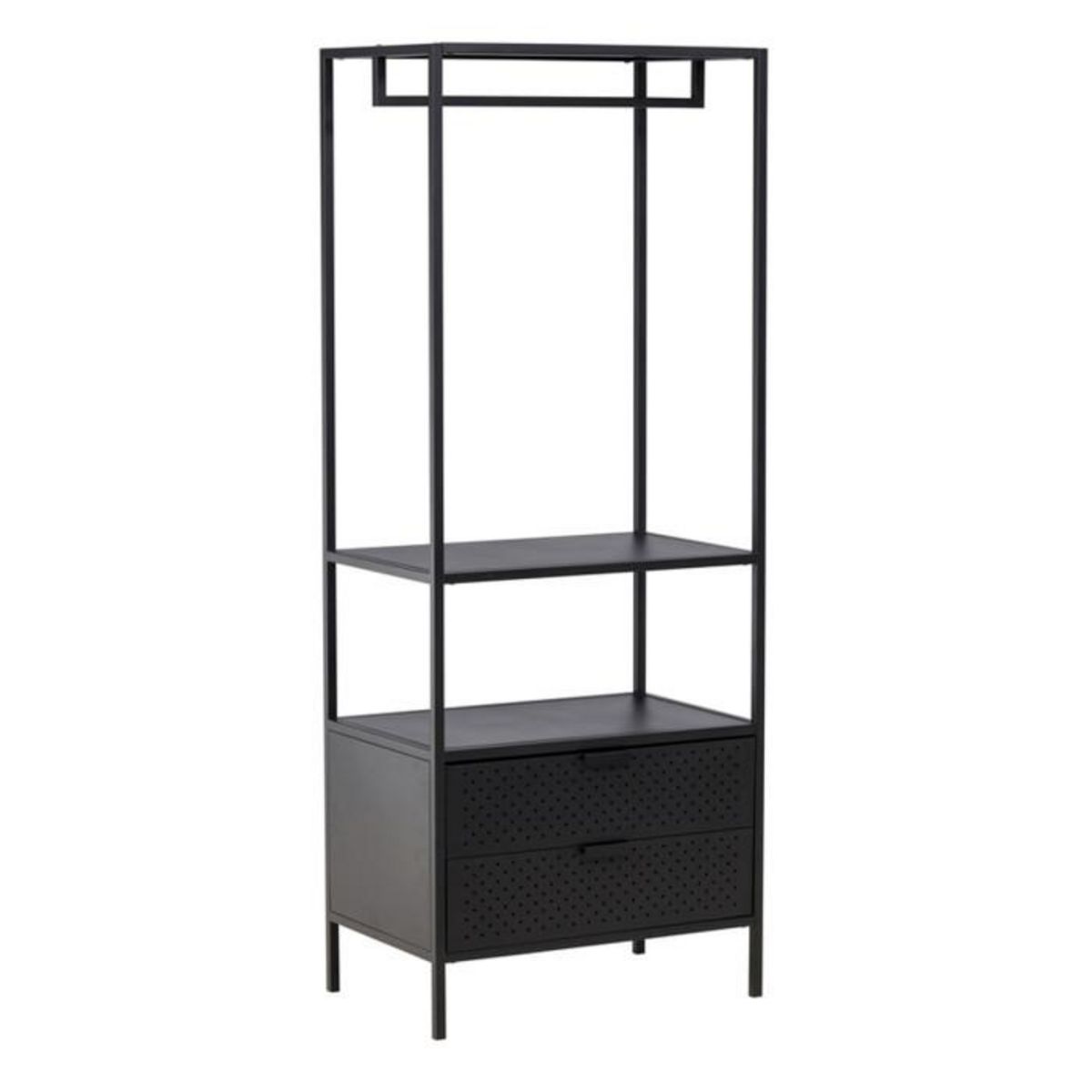 Informations Techniques : Dimensions : L. 70 x l. 45 x H. 180 cm Matière : Acier Spécificités : Moderne & Minimaliste Portant à vêtement design 2 tiroirs & 2 étagères Avec 1 tringle Poids max supporté : 20 kg Poids : 20 kg Couleur : Noir