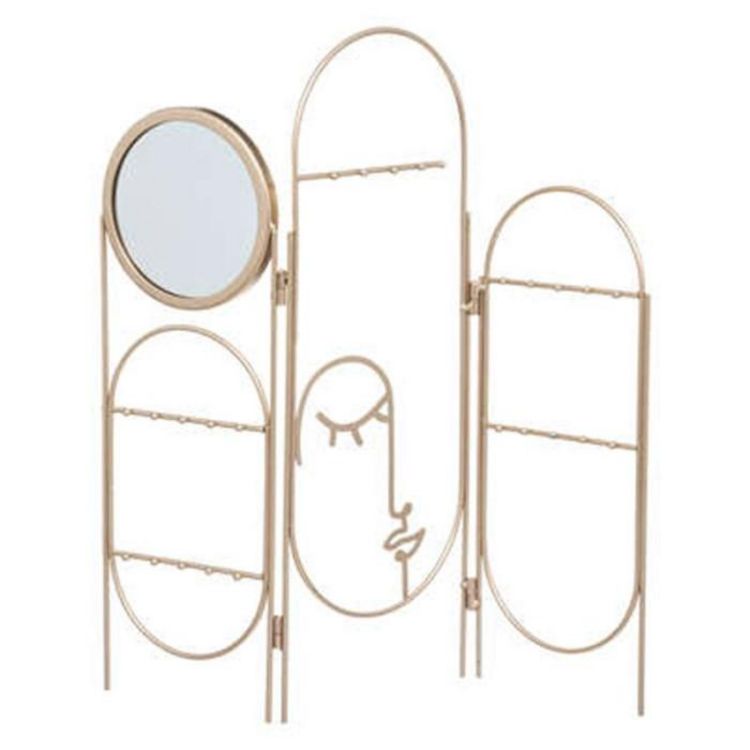 Informations Techniques : Dimensions : L. 39 x l. 1 x H. 40,5 cm Fermé : L. 15 x l. 3 x H. 40,5 cm Matière : Métal & Verre Spécificités : Pratique & Utile Porte-Bijoux Déco A Poser Avec Miroir Poids : 0,5 kg Couleur : Cuivre