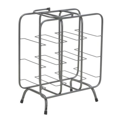 Informations Techniques : Dimensions : L. 40 x l. 23 x H. 47,5 cm Matière : Métal Spécificités : Pratique & Utile Porte-bouteilles 3 niveaux Avec 9 emplacements Poids : 1,5 kg Couleur : Gris Foncé