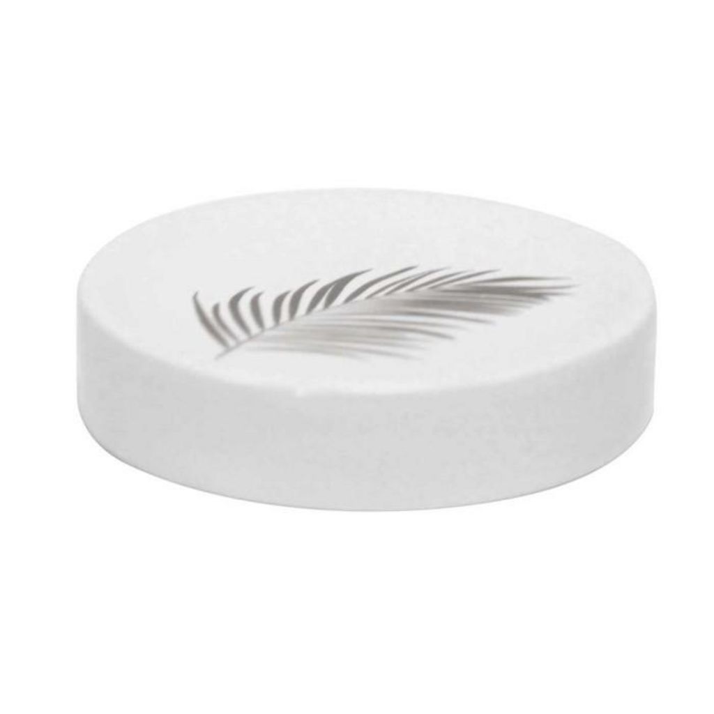 Informations Techniques : Dimensions : D. 11,1 x H. 2,4 cm Produit Packagé : L. 12 x l. 12 x H. 3 cm Matière : Céramique Spécificités : Design & Pratique Porte Savon design Forme Ronde Imprimé Poids : 0,197 kg Couleur : Blanc & Argent