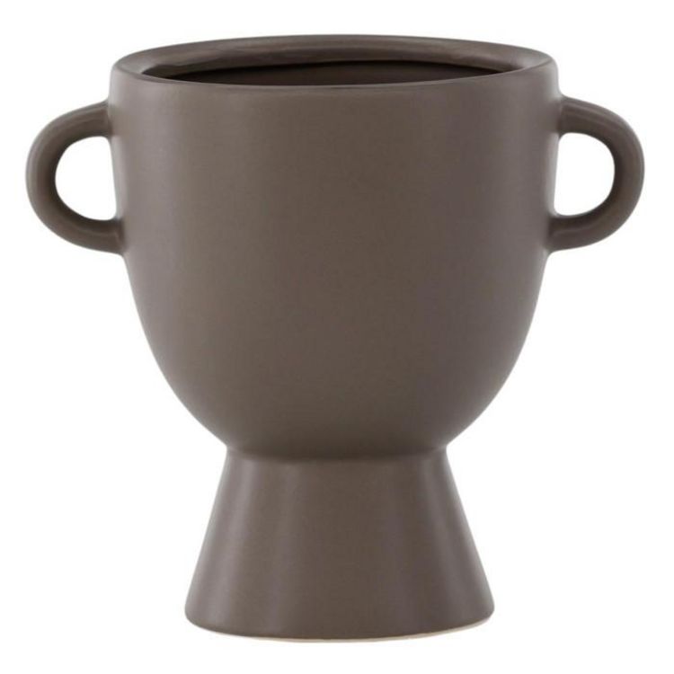 Informations Techniques : Dimensions : L. 20 x l. 14 x H. 18 cm Diamètre : D. 14 cm Matière : Grès Spécificités : Moderne & Élégant Vase design Avec petites anses Poids : 1,05 kg Couleur : Marron