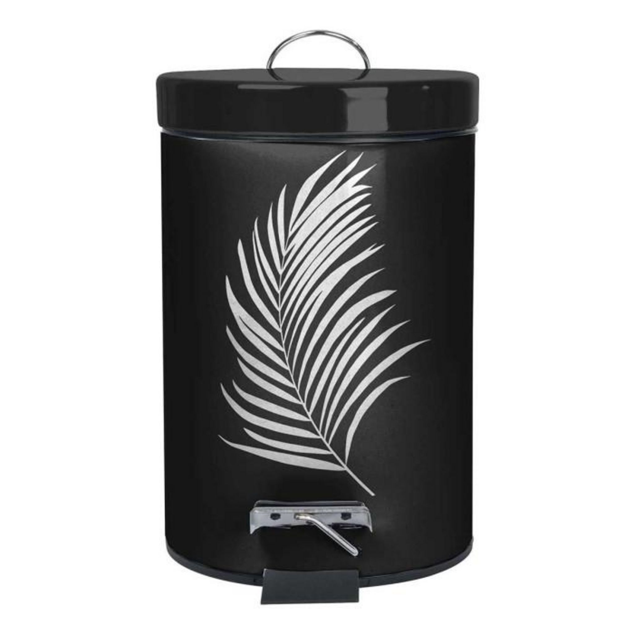 Informations Techniques : Dimensions : L. 21 x l. 17 x H. 26 cm Matière : Métal Spécificités : Design & Pratique Poubelle à Pédale Forme Ronde Imprimé Contenance : 3L Poids : 0,662 kg Couleur : Noir & Argent