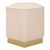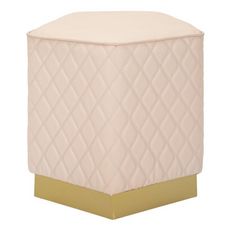 Informations Techniques : Dimensions : L. 38 x l. 38 x H. 38 cm Matières : Bois (Pin), MDF, Métal & Plastique Spécificités : Pratique & Tendance Pouf design Revêtement matelassé Forme pentagonale Finition or Poids : 3,5 kg Couleur : Rose & Or