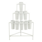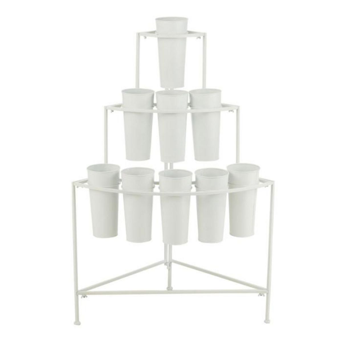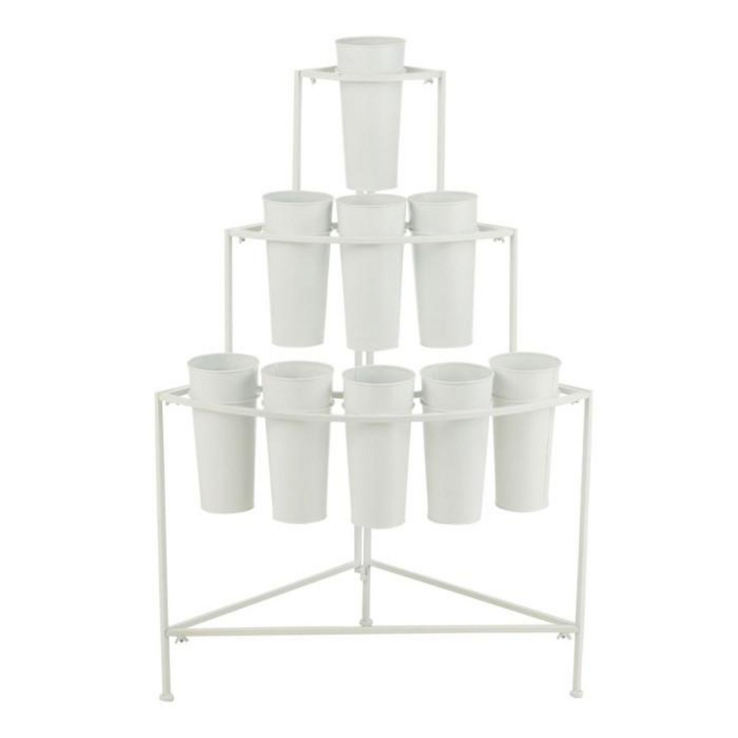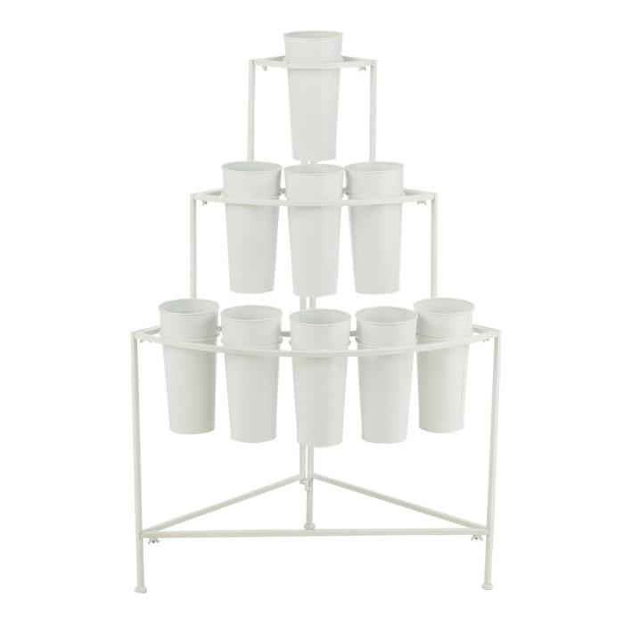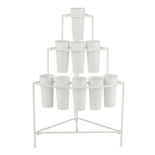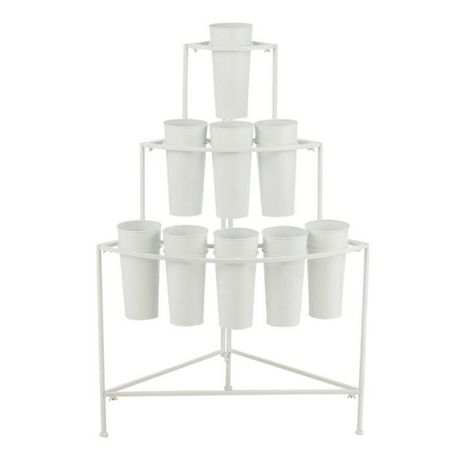 Informations Techniques : Dimensions : Présentoir : L. 67 x l. 46 x H. 95,5 cm Pots : D. 11 x H. 44 cm Matière : Métal Spécificités : Pratique & Utile Présentoir à fleurs 9 pièces Forme triangulaire A monter soi-même Poids : 4,53 kg Couleur : Blanc