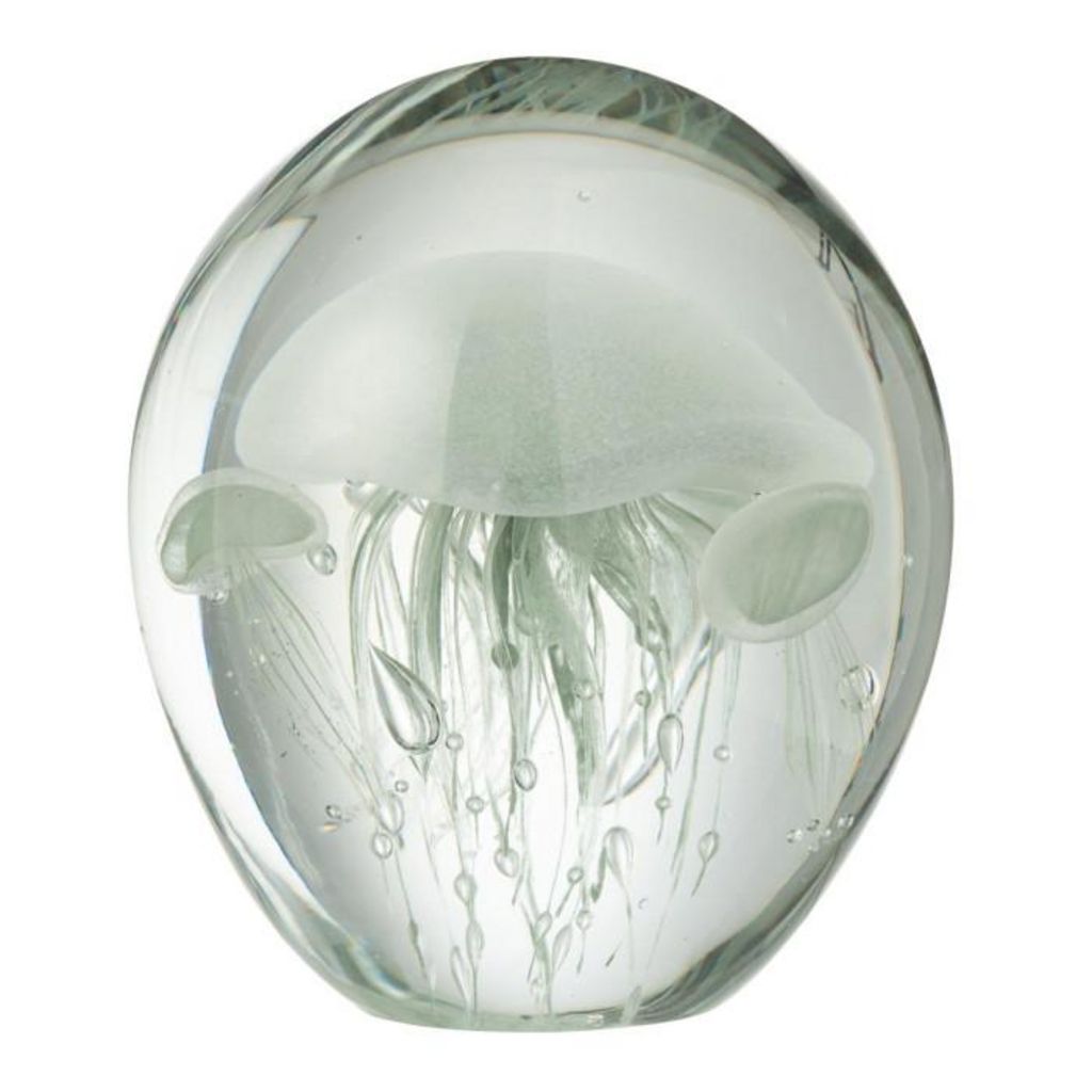 Informations Techniques : Dimensions : L. 13 x l. 13 x H. 16 cm Matière : 100% Verre Spécificités : Déco & Utile Presse-papier rond Design méduses Vendu à l'unité Poids : 4,12 kg Couleur : Transparent & Vert