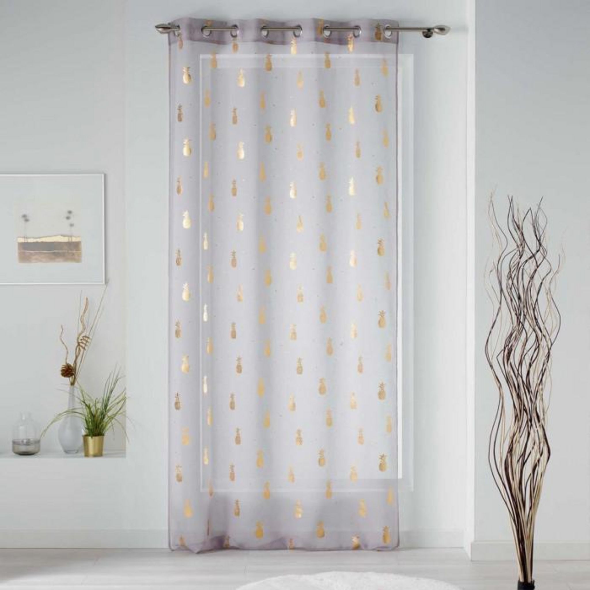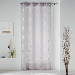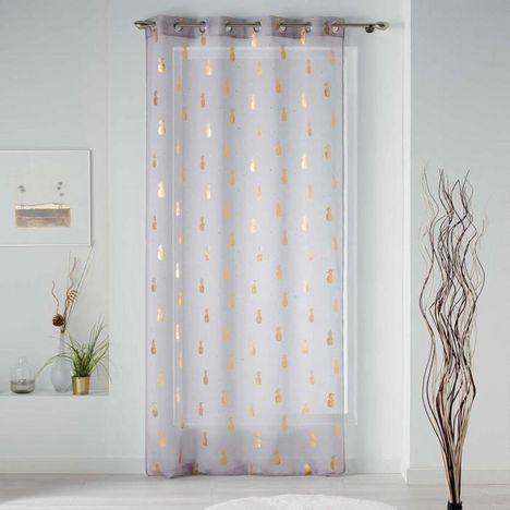 Informations Techniques : Dimensions : L. 130 x H. 240 cm Matière : Polyester Spécificités : Design & Pratique Rideau à oeillets Voile effet sablé Imprimé métallisé Motif ananas Facile d'entretien & d'utilisation Poids : 0.36 kg Couleur : Gris & Or