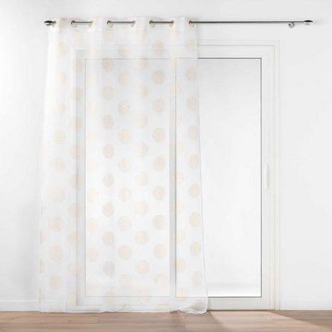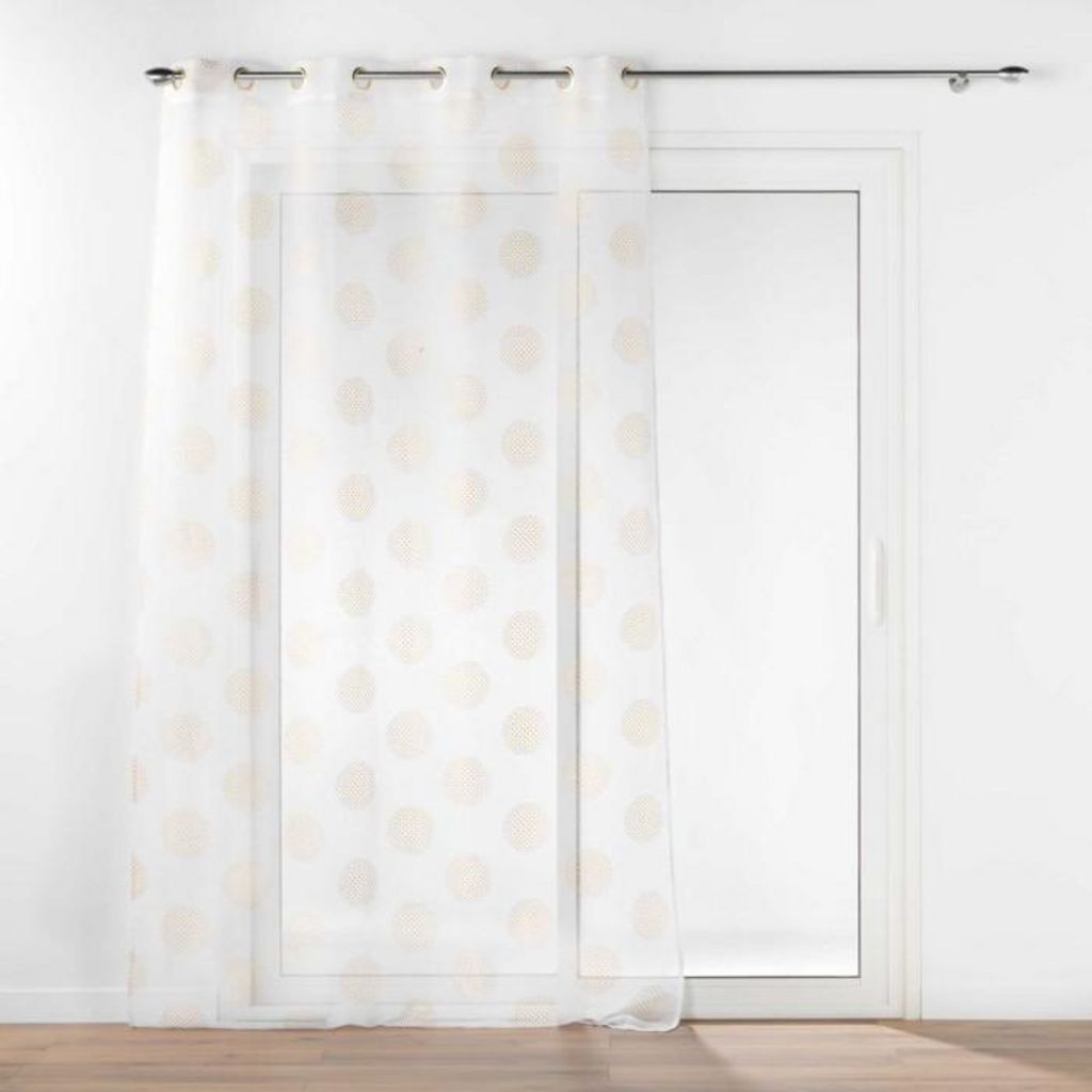 Informations Techniques : Dimensions : L. 140 x H. 280 cm Matière : 100% Polyester Spécificités : Élégant & Durable Rideau voilage 8 œillets Imprimé pois métallisés Finition voile sablé Résistant aux plis Entretien : Lavage à 30° Pas de séchage en machine Repassage à 110° Poids : 0,35 kg Couleur : O