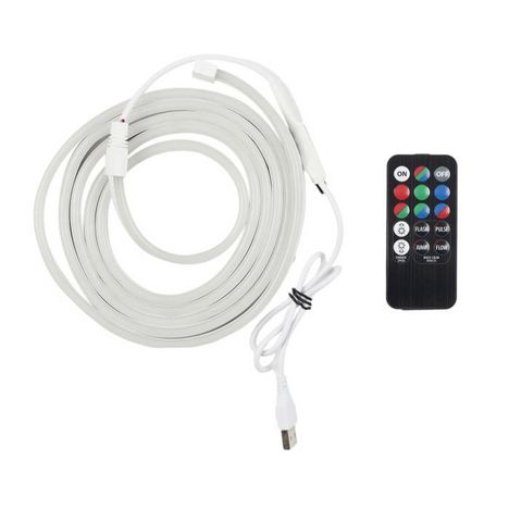 Informations Techniques : Dimensions : L. 200 x l. 1,2 x H. 0,7 cm Matières : Silicone & Caoutchouc Spécificités : Pratique & Utile Ruban LED Télécommande incluse 3 Couleurs 3 modes Bicolore 1 mode Tricolore 4 Jeux de Lumières Luminosité Réglable 120 LEDs Raccordement USB Pile incluse dans la Téléc