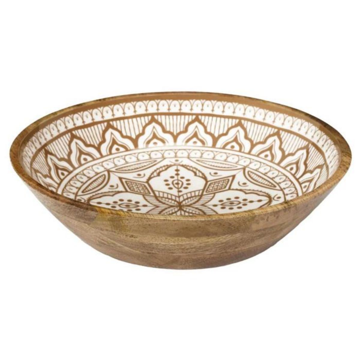 Informations Techniques : Dimensions : D. 33 x H. 7,5 cm Matière : 100% Bois (Manguier) Spécificités : Solide & Utile Saladier rond Intérieur à motifs Certification FSC Poids : 0,94 kg Couleur : Terracotta