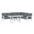 Informations Techniques : Dimensions : Canapé : L. 279/216 x l. 65 x H. 77 cm Assise : L. 254 x l. 55 x H. 31 cm Table : L. 140 x l. 75 x H. 70 cm Matières : Aluminium & Polyester Spécificités : Confortable & Luxueux Salon d'angle d'extérieur Canapé d'angle 5/6 places Avec table haute Coussins incl