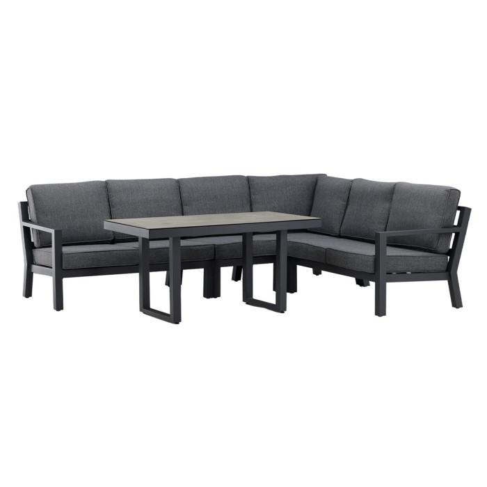 Informations Techniques : Dimensions : Canapé : L. 279/216 x l. 65 x H. 77 cm Assise : L. 254 x l. 55 x H. 31 cm Table : L. 140 x l. 75 x H. 70 cm Matières : Aluminium & Polyester Spécificités : Confortable & Luxueux Salon d'angle d'extérieur Canapé d'angle 5/6 places Avec table haute Coussins incl