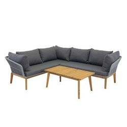 Informations Techniques : Dimensions : Canapé : L. 210/160 x l. 75 x H. 76 cm Assise : L. 145 x l. 65 x H. 33 cm Table : L. 110 x l. 60 x H. 45 cm Matières : Bois (Acacia) & Polyester Spécificités : Tendance & Élégant Salon d'angle d'extérieur Canapé d'angle 4/5 places Avec table basse Dossier de c