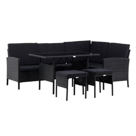 Informations Techniques : Dimensions : Canapé : L. 145/200 x l. 56 x H. 73 cm Assise : L. 135 x l. 56 x H. 34 cm Table : L. 110 x l. 70 x H. 65 cm Matières : Acier, Polypropylène, Verre & Polyester Spécificités : Élégant & Intemporel Salon d'angle d'extérieur Canapé d'angle 4/5 places Avec 2 poufs