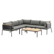 Informations Techniques : Dimensions : Canapé : L. 226/165 x l. 80 x H. 66 cm Assise : L. 77 x l. 70 x H. 35 cm Table : L. 106 x l. 60 x H. 35 cm Matières : Acier, Bois (Teck) & Polyester Spécificités : Élégant & Tendance Salon d'angle d'extérieur Canapé d'angle modulable Avec table basse Plateau e