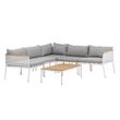 Informations Techniques : Dimensions : Canapé : L. 233 x l. 80 x H. 66 cm Assise : L. 77 x l. 70 x H. 34 cm Table : L. 106 x l. 60 x H. 35 cm Matières : Acier, Bois (Teck) & Polyester Spécificités : Élégant & Tendance Salon d'angle d'extérieur Canapé d'angle modulable Avec table basse Plateau en bo