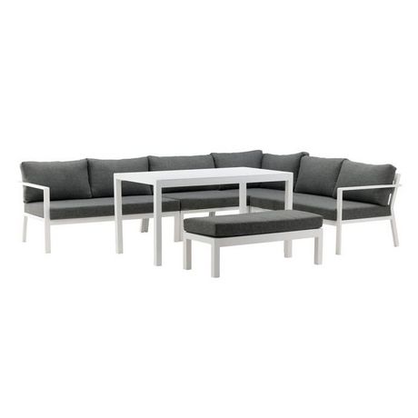 Informations Techniques : Dimensions : Canapé : L. 294/210 x l. 80 x H. 66 cm Assise : L. 135 x l. 72 x H. 30 cm Table : L. 140 x l. 82 x H. 73 cm Matières : Aluminium & Polyester Spécificités : Confortable & Pratique Salon d'angle d'extérieur Canapé d'angle 5/6 places Avec table haute Coussins moe