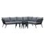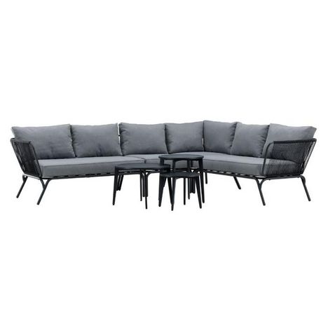 Informations Techniques : Dimensions : Canapé : L. 283/220,5 x l. 79 x H. 70 cm Assise : L. 210 x l. 64 x H 29,5 cm Table : D. 50 x H. 50 cm Matières : Aluminium & Polyester Spécificités : Pratique & Confortable Salon d'extérieur Canapé d'angle 5/6 places Table ronde en 3 parties Dossier en corde d