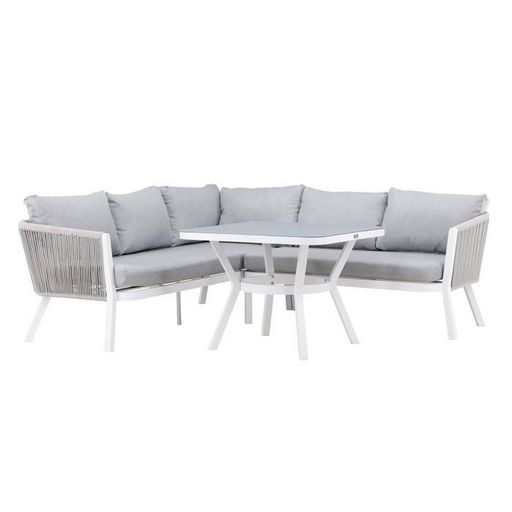 Informations Techniques : Dimensions : Canapé : L. 206/143 x l. 65 x H. 71,5 cm Assise : L. 183,5 x l. 65 x H. 34 cm Table : L. 90 x l. 90 x H. 67 cm Matières : Aluminium & Polyester Spécificités : Élégant & Robuste Salon d'angle d'extérieur Canapé d'angle 4/5 places Avec table haute Dossier corde