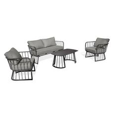 Informations Techniques : Dimensions : Canapé : L. 150 x l. 72 x H. 64 cm Fauteuil : L. 70 x l. 68 x H. 64 cm Table basse : L. 100 x l. 60 x H. 45 cm Matière : Aluminium Spécificités : Confortable & Tendance Salon de jardin 4 places Coussins déhoussables À monter soi-même Contient : 1 x canapé 2 p
