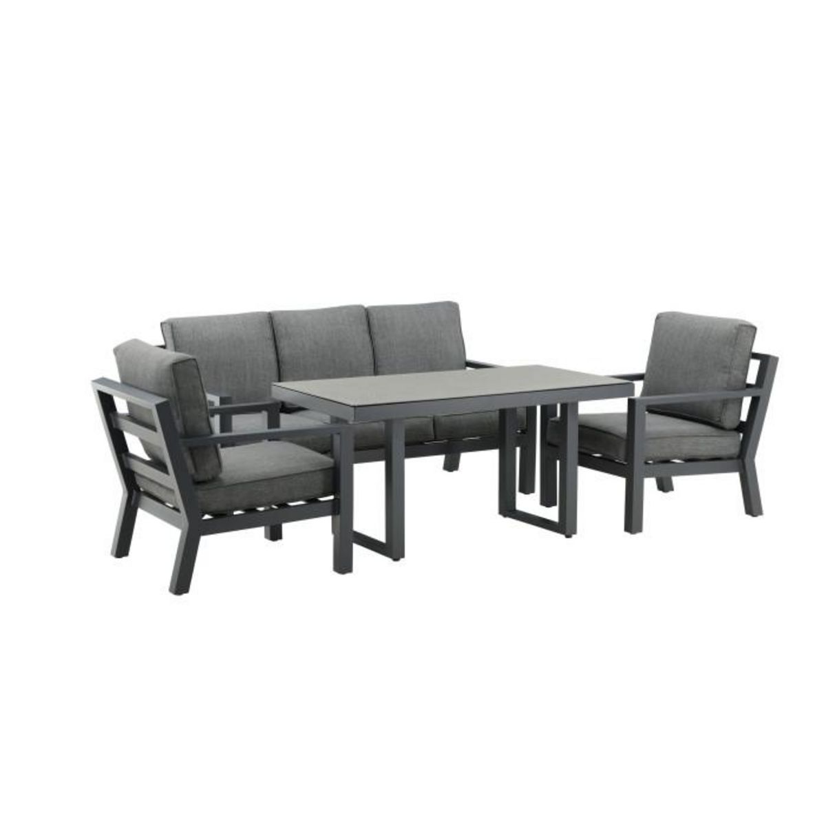 Informations Techniques : Dimensions : Canapé : L. 171 x l. 84 x H. 77 cm Table : L. 140 x l. 75 x H. 69 cm Fauteuils : L. 75 x l. 84 x H. 77 cm Accoudoirs : l. 6 cm Matières : Aluminium Spécificités : Confortable & Élégant Salon de jardin 5 places Déjà monté Table avec plateau effet pierre Contie