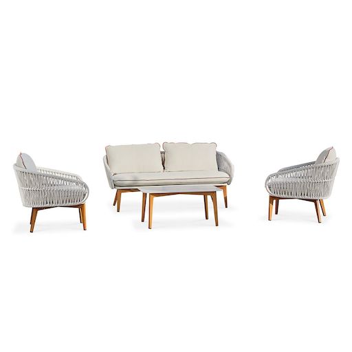Informations Techniques : Dimensions : Canapé : L. 166 x l. 78 x H. 71 cm Fauteuil : L. 76,5 x l. 78 x H. 71 cm Table basse : L. 90 x l. 55 x H. 40 cm Matières : Aluminium, Corde & Verre Spécificités : Naturel & Robuste Salon d'extérieur 5 places Design effet bois Détails tissés en corde Plateau en