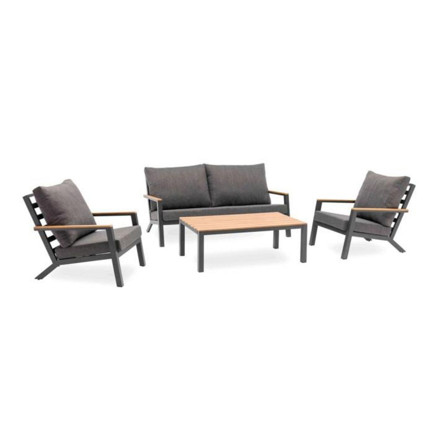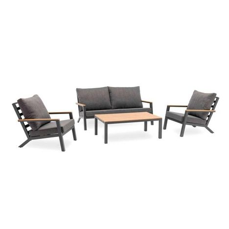 Informations Techniques : Dimensions : Canapé : L. 175 x l. 99 x H. 79 cm Fauteuil : L. 75,5 x l. 99 x H. 79 cm Table basse : L. 120 x l. 70 x H. 43 cm Matières : Aluminium & Bois (Contreplaqué) Spécificités : Tendance & Confortable Salon de jardin 5 places Coussins déhoussables À monter soi-même