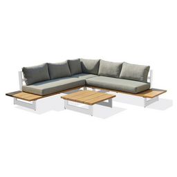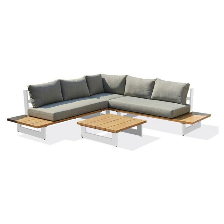Informations Techniques : Dimensions : Table basse : L. 82 x l. 82 x H. 26 cm Méridienne : L. 175 x l. 85 x H. 71 cm Angle : L. 85 x l. 85 x H. 71 cm Coussin d'assise : H. 12 cm Matière : Aluminium Spécificités : Élégant & Confortable Salon d'angle de jardin 5 places Tablettes latérales Coussins dé