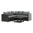 Informations Techniques : Dimensions : Canapé : L. 200 x l. 75 x H. 70 cm Assise : l. 69 x H. 40 cm Table : L. 65 x l. 65 x H. 44 cm Matières : Aluminium, Verre, Polypropylène & Polyester Spécificités : Tendance & Élégant Salon d'extérieur design Canapé d'angle 4/5 places Table basse avec étagère D