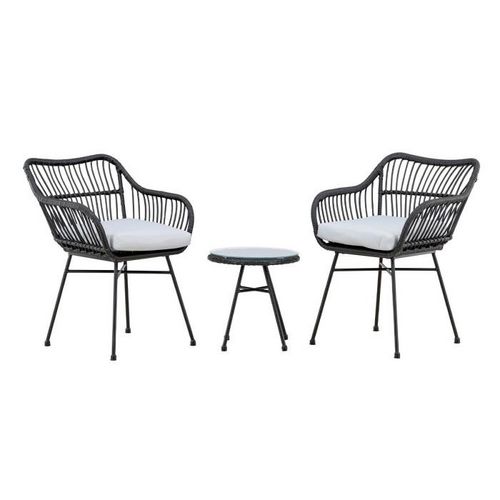 Informations Techniques : Dimensions : Fauteuil : L. 60 x l. 63 x H. 81 cm Assise : L. 39 x l. 41,5 x H. 44 cm Table : D. 40 x H. 41 cm Matières : Acier, Verre, Polypropylène & Polyester Spécificités : Intemporel & Élégant Salon d'extérieur 2 fauteuils et table basse Plateau en verre Design effet r