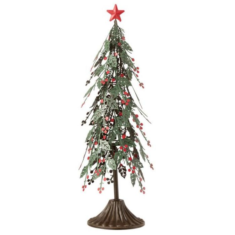 Informations Techniques : Dimensions : L. 12,5 x l. 12,5 x H. 40 cm Matière : Métal Spécificités : Original & Tendance Sapin de Noël A Poser Forme Ronde Sur Pied Design Feuilles Poids : 0,295 kg Couleur : Vert & Rouge