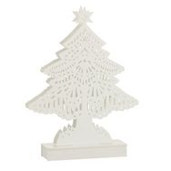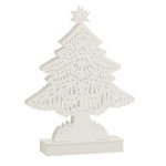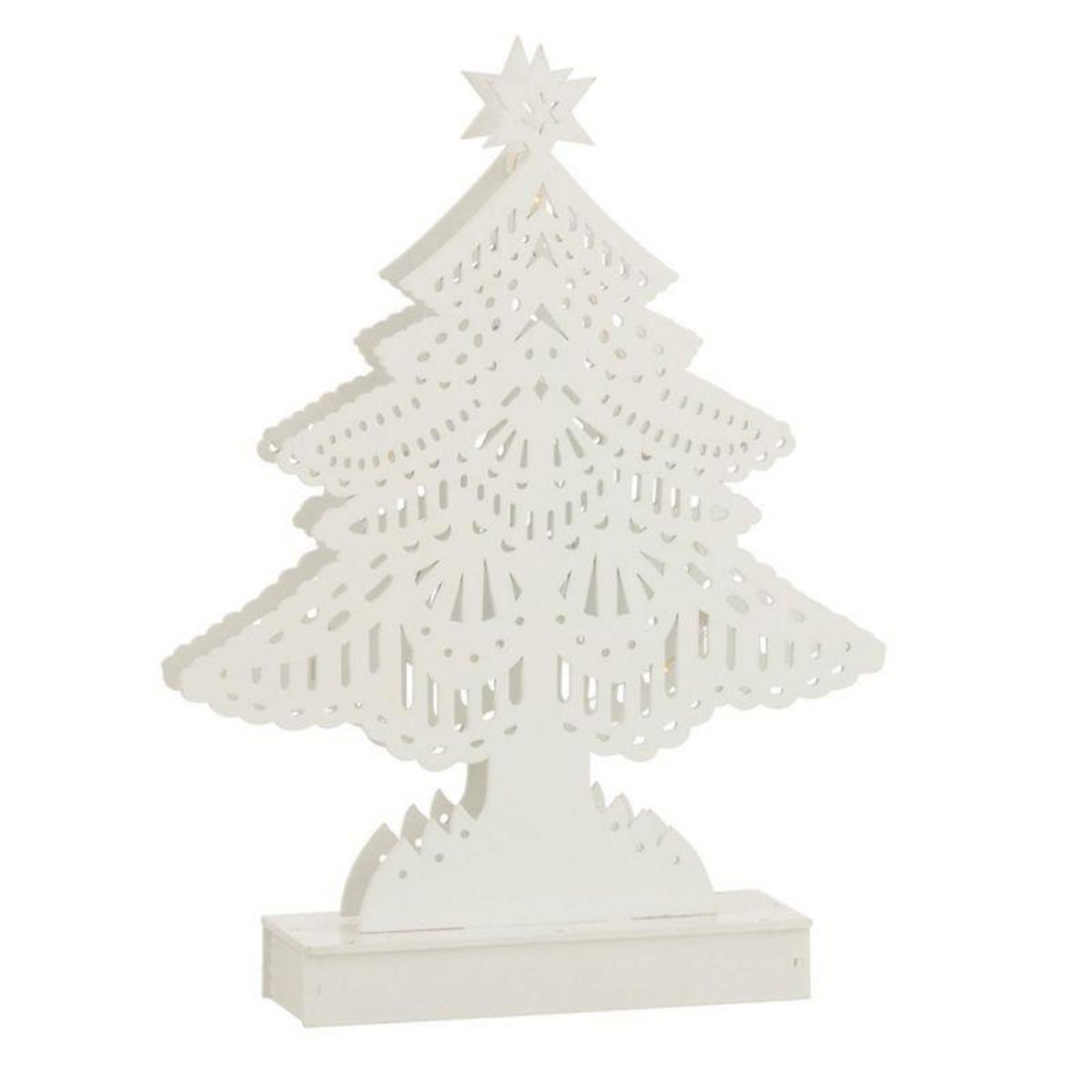 Informations Techniques : Dimensions : L. 19 x l. 6 x H. 25,5 cm Matière : Bois Spécificités : Pratique & Utile Sapin de Noël A Poser Fonctionnement à LED Poids : 0,089 kg Couleur : Blanc
