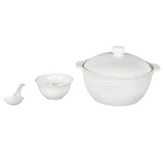 Informations Techniques : Dimensions : L. 42 x l. 31 x H. 16,5 cm Matière : 100% Porcelaine Spécificités : Utile & Moderne Service à soupe 8 pièces Motif relief Contient : 1 soupière (2,7 L) 1 louche de service 6 bols (25 cl) Compatible : Lave-vaisselle & Micro-ondes Non compatible : Four & Congélat