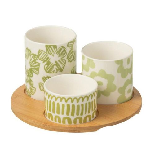 Informations Techniques : Dimensions : L. 20 x l. 20 x H. 10,5 cm Matières : Céramique & Bambou Spécificités : Pratique & Tendance Serivce apéritif 3 pots et un plateau Compatible : Lave-vaisselle, micro-ondes & four (sauf plateau) Forme ronde Poids : 0,87 kg Couleur : Vert