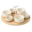 Informations Techniques : Dimensions : D. 29 x H. 5,5 cm Matières : 50% Céramique, 45% Bambou & 5% Métal Spécificités : Pratique & Utile Service apéritif 7 pièces Imprimé moucheté Contient : 6 x coupelles 1 x plateau Compatibilités : Lave-vaisselle et micro-ondes Poids : 1,59 kg Couleur : Blanc