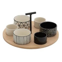 Informations Techniques : Dimensions : D. 29 x H. 5,5 cm Matières : 50% Céramique, 45% Bambou & 5% Métal Spécificités : Pratique & Utile Service apéritif 7 pièces Imprimé géométrique Contient : 6 x coupelles 1 x plateau Compatibilités : Lave-vaisselle et micro-ondes Poids : 1,54 kg Couleur : Noir &