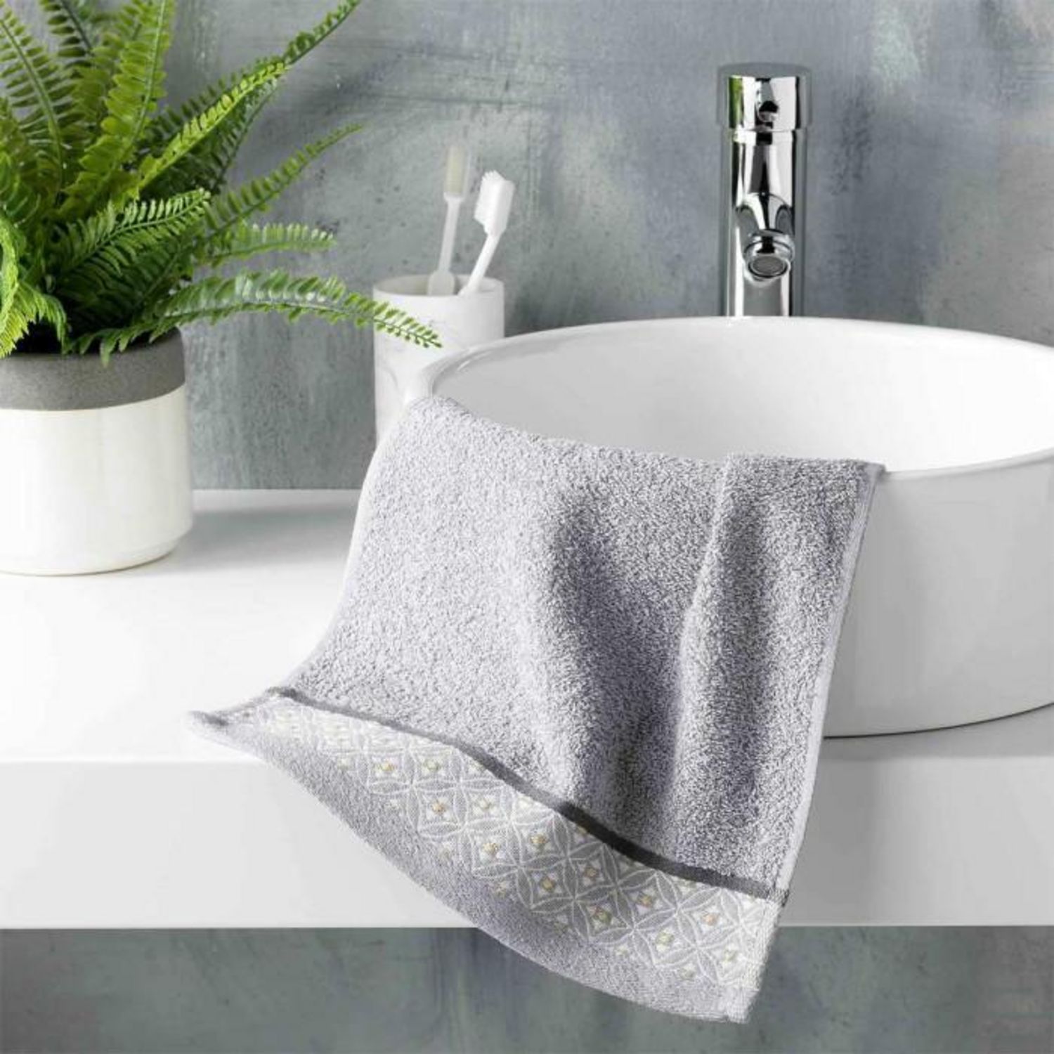 Informations Techniques : Dimensions : L. 50 x l. 30 cm Matière : 100% Coton Spécificités : Tendance & Pratique Serviette d'Invité Forme Rectangulaire Tissu Éponge Motif Jacquard Poids : 0,07 kg Couleur : Gris