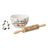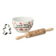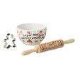 Informations Techniques : Dimensions : L. 35 x l. 16,8 x H. 28 cm Matières : Céramique, Bois (Pin) & Acier Spécificités : Utile & Festif Set de pâtisserie de Noël Bol avec inscription Rouleau de pâtisserie à motifs Emporte-pièce pain d'épice Poids : 0,94 kg Couleur : Multicolore
