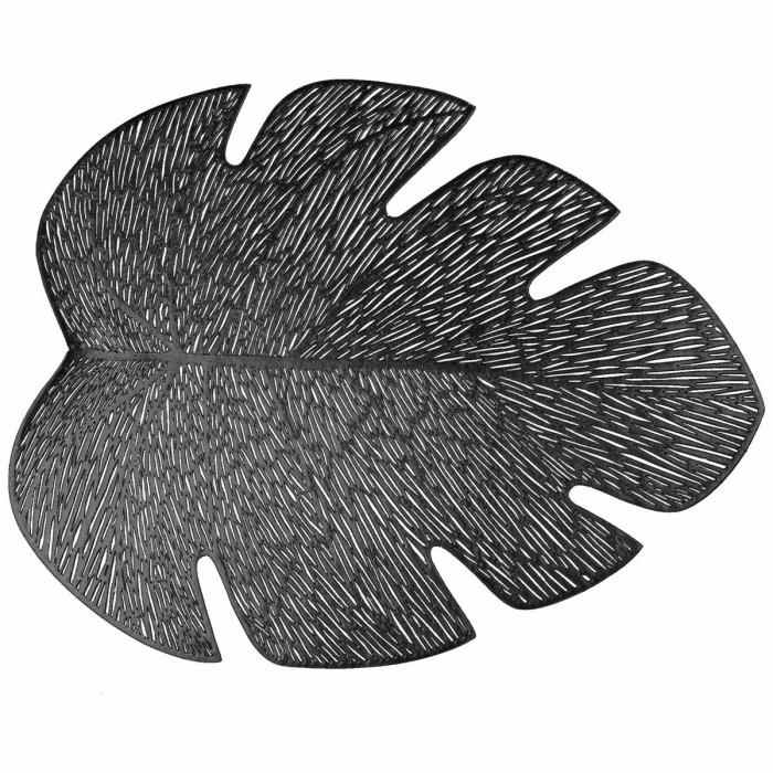 Informations Techniques : Dimensions : L. 46 x l. 36 cm Matière : 100% PVC Spécificités : Original & Utile Set de table Style ajouré En forme de feuille Poids : 0,11 kg Couleur : Noir