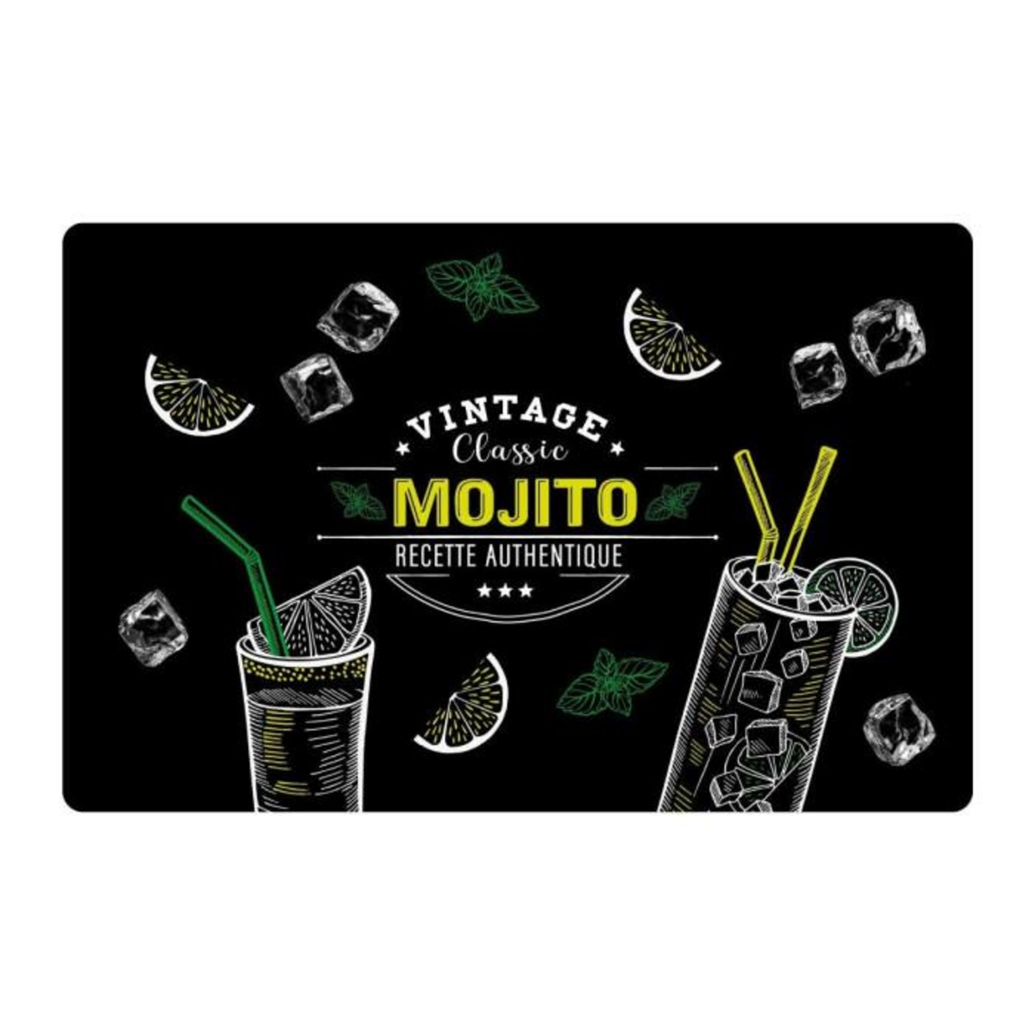 Informations Techniques : Dimensions : L. 28,5 x l. 44 cm Matière : 100% Polypropylène Spécificités : Pratique & Tendance Set de table déco Motif boissons Inscription Vintage altic mojito recette authentique Entretien facile Forme rectangulaire Poids : 0,06 kg Couleur : Noir
