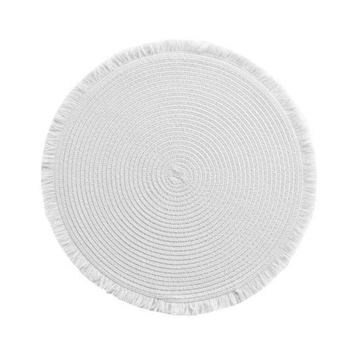 Informations Techniques : Dimensions : D. 38 cm Matière : 100% Polyester Spécificités : Tendance & Utile Set de table Avec franges Forme ronde Poids : 0,05 kg Couleur : Blanc
