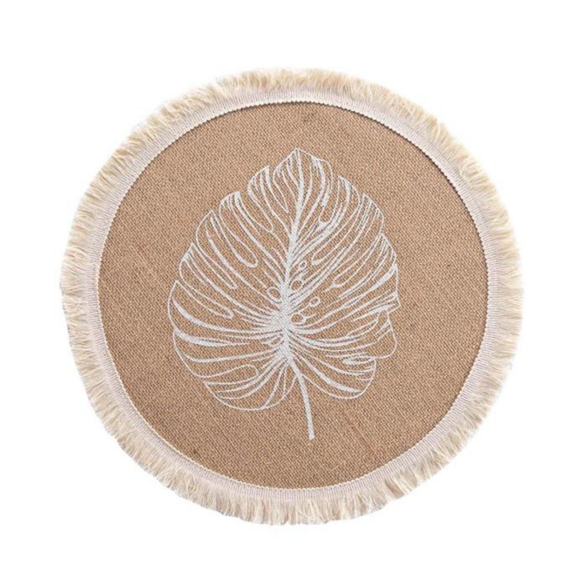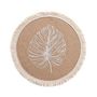 Informations Techniques : Dimensions : D. 38 cm Matières : Jute, Polyester & Coton Spécificités : Tendance & Utile Set de table Avec franges Motif feuille Forme ronde Poids : 0,04 kg Couleur : Naturel