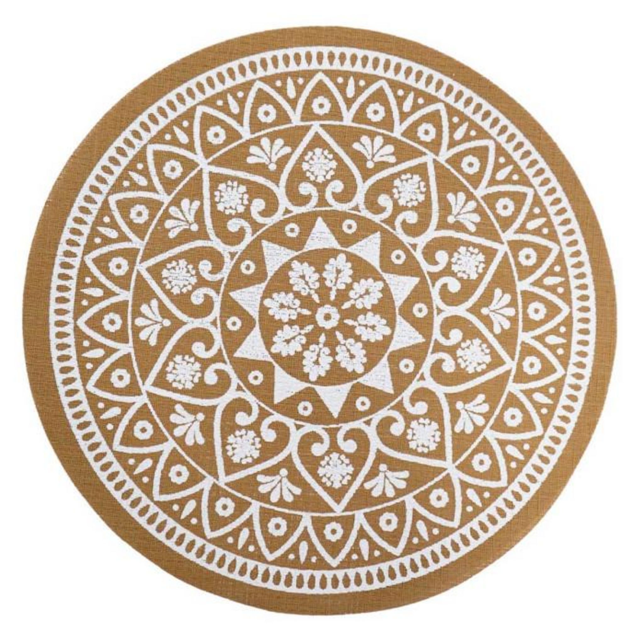 Informations Techniques : Dimensions : D. 38 cm Matières : 80% PVC & 20% Polyester Spécificités : Pratique & Utile Set de table rond Imprimé mandala Label Oeko-Tex Poids : 0,07 kg Couleur : Naturel