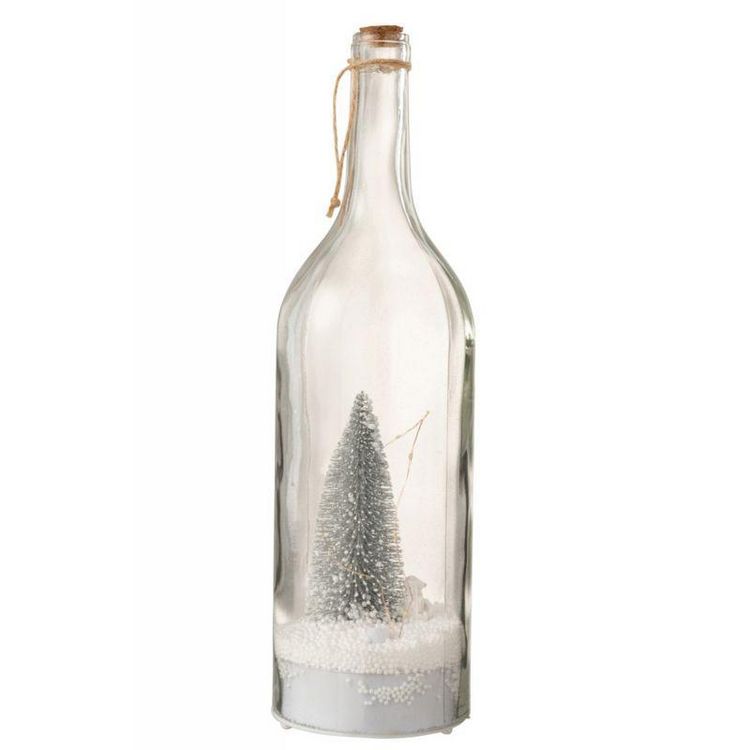 Informations Techniques : Dimensions : D. 12,5 x H. 44,5 cm Matière : Verre Spécificités : Charmant & Original Décoration de Noël Forme de Bouteille Eclairage LED Facile d'entretien & d'utilisation Poids : 1,5 kg Couleur : Transparent & Argent